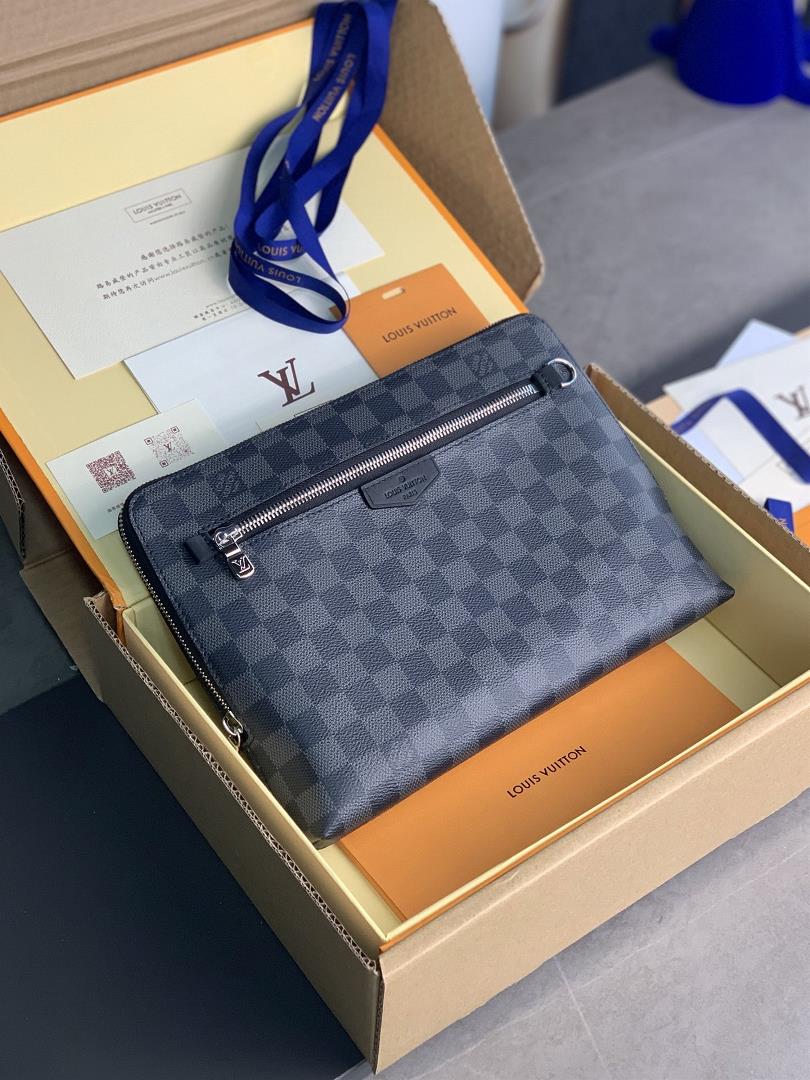 The N60417 Hagrid New Pouch tote bag is made of Damier Graphite canvas and metal parts featuring a zippered outer pocket inner patch pocket and card holder embellished with Paris logo embossed lab
