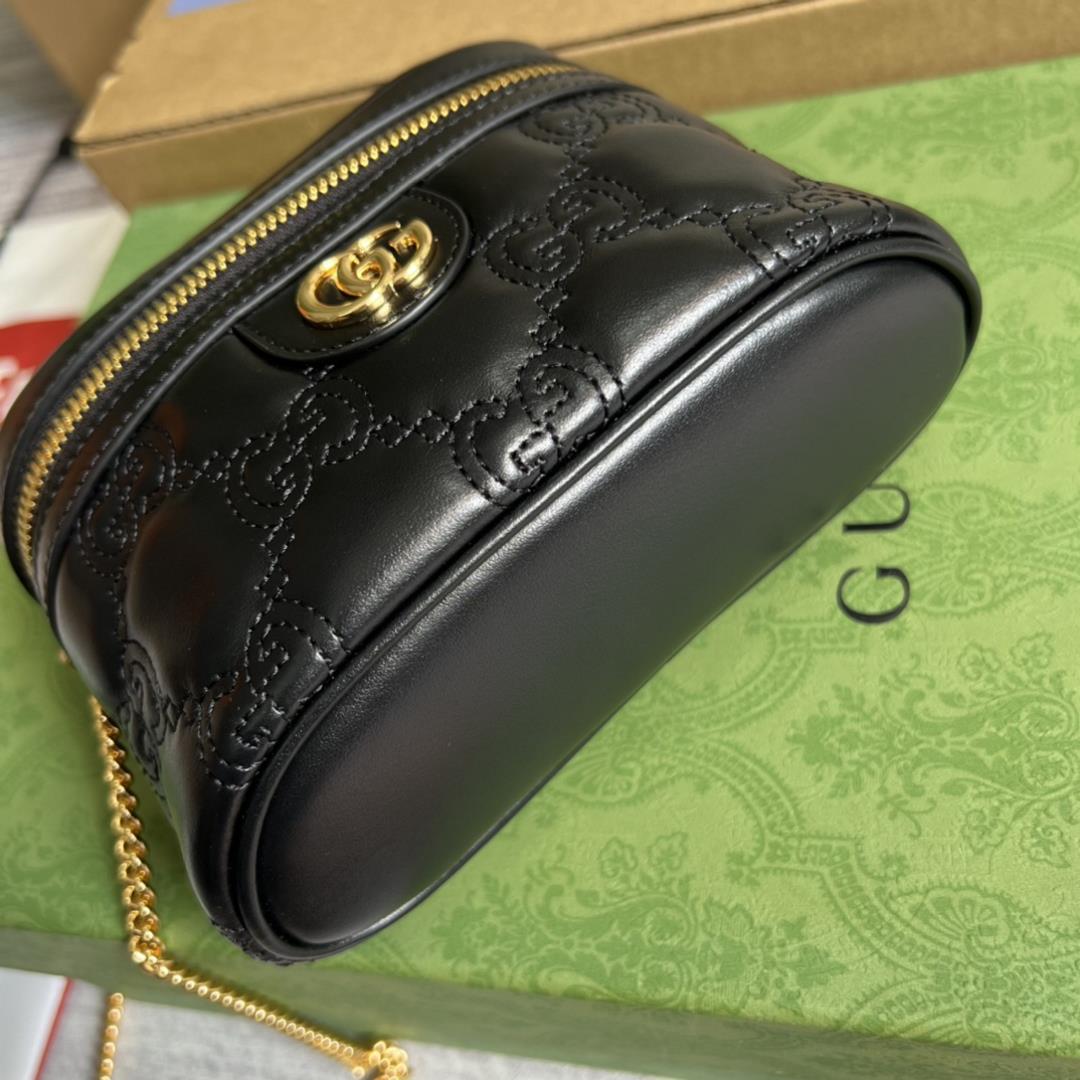 . Equipped with a full set of specialty green packaging GG Matelassmini handbags, quilted leather interprets the brand's iconic materials with a soft texture. The textured geometric patterns vividly depict various small leather accessories, including this black mini handbag. The front is adorned with dual G accessories, injecting brand identity into the entire design. Hide detailed information, black GG Matelass leather, gold adjustable accessory double G, internal 1 open pocket and hook buckle, handle 1.5cm high, shoulder strap 50cm high, zipper closure .Model 723770 .Size 16 W x 10.5 H x 5 cm DColor black embossed G full leather.