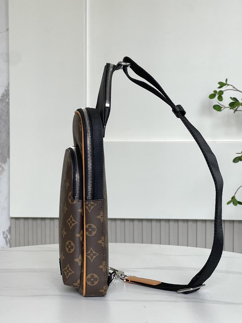 M46327 New Color Matching20 x 31 x 7 cmLength x Height x WidthMonogram Macassar coated canvasCowhide leather trimFabric liningFront square metal partsMain compartmentZipper front pocketTop small zipper pocketThe shoulder strap is non detachable and adjustableHalf length of strap 29.0 cmThe half length of the strap can be adjusted to 51.0cm E68580