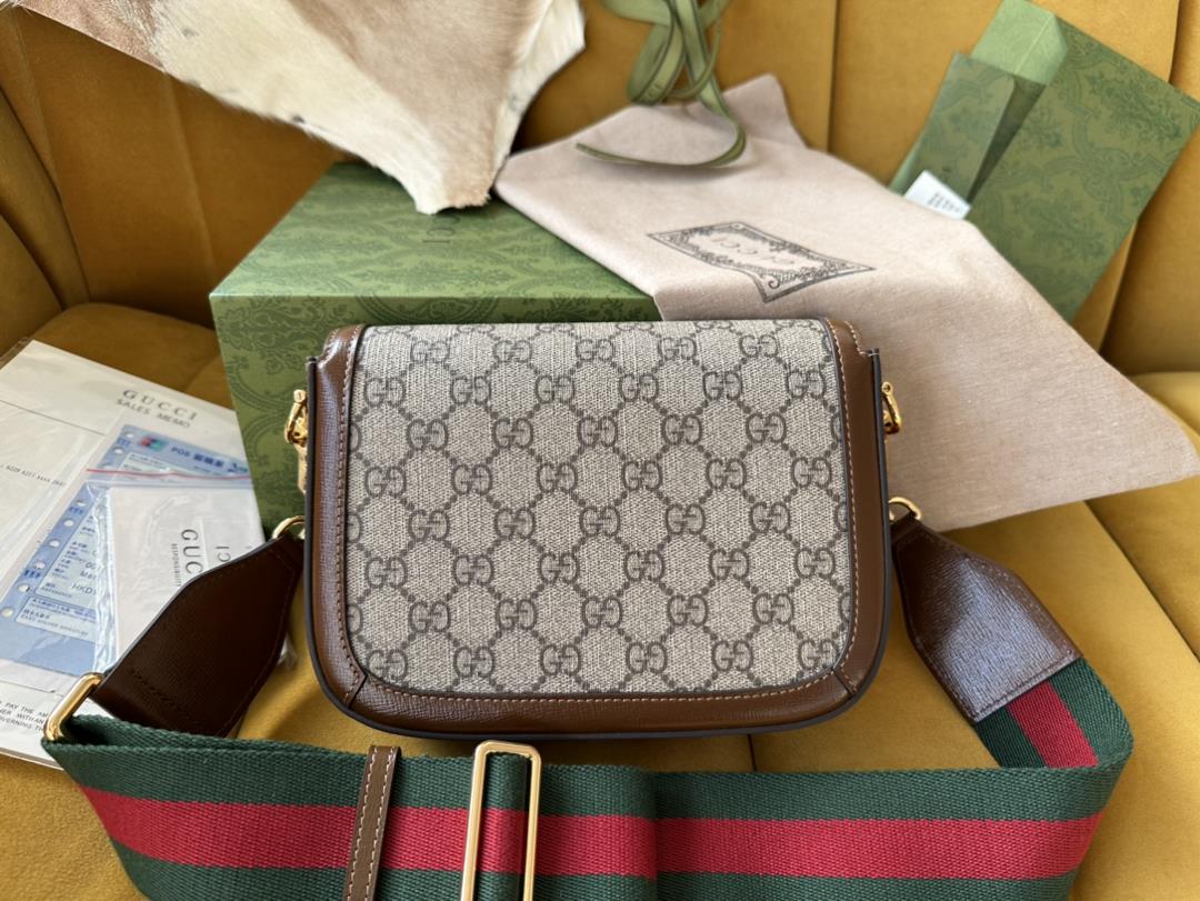 Original leather Gucci Horsebit 1955 series mini handbag 658574 adds a mix and match style to this retro style series. This mini handbag comes with two different shoulder straps paired with the same colored leather shoulder straps to present a low-key and elegant atmosphere. The red and green webbing shoulder straps highlight the strong brand identity. The handbag is made of double G letters interwoven pattern canvas and decorated with brown leather piping. The size is 20.514.55cm and comes with the original packaging