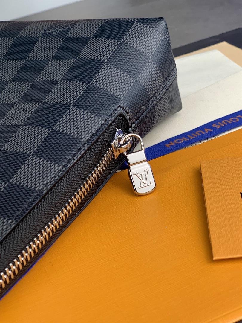 The N60417 Hagrid New Pouch tote bag is made of Damier Graphite canvas and metal parts, featuring a zippered outer pocket, inner patch pocket, and card holder, embellished with Paris logo embossed labels, showcasing a fusion of functionality and trend. Detailed features 21.0 x 27.0 x 5.0cm E68350
