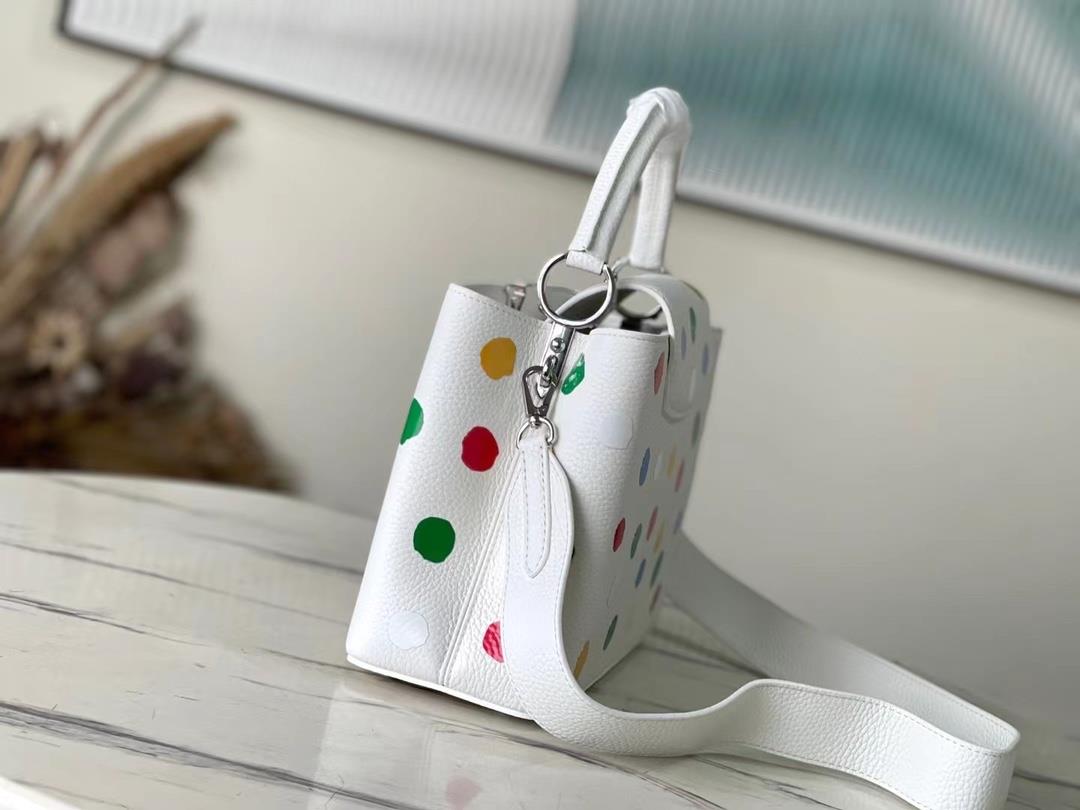 Top level original sheet M21637 48865 white spell color dot medium x Yayoi Kusama cooperation series reinterprets traditional design from an artistic perspective This LV x YK Capucines handbag turns the psychedelic waves described by the artist into colorful prints presented in the soft Taurillon leather zipper inner bag through silk screen printing. The pumpkin shaped zipper head indicates another classic image in Yayoi Kusama's works Size 31.5 20 11 cm E681400