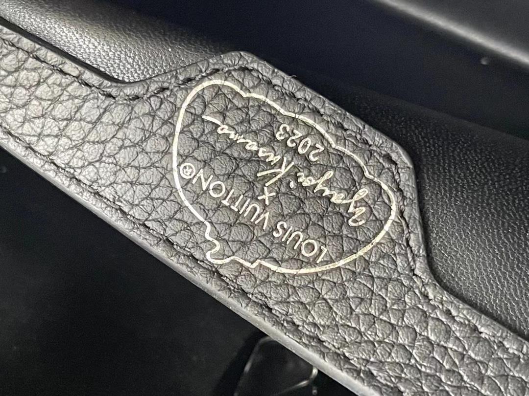 Top level original sheet M2169148865 black spell white dot medium x Yayoi Kusama cooperation series reinterprets traditional design from an artistic perspective This LV x YK Capucines handbag turns the psychedelic waves described by the artist into colorful prints presented in the soft Taurillon leather zipper inner bag through silk screen printing. The pumpkin shaped zipper head indicates another classic image in Yayoi Kusama's works Size 31.5 20 11 cm E681400