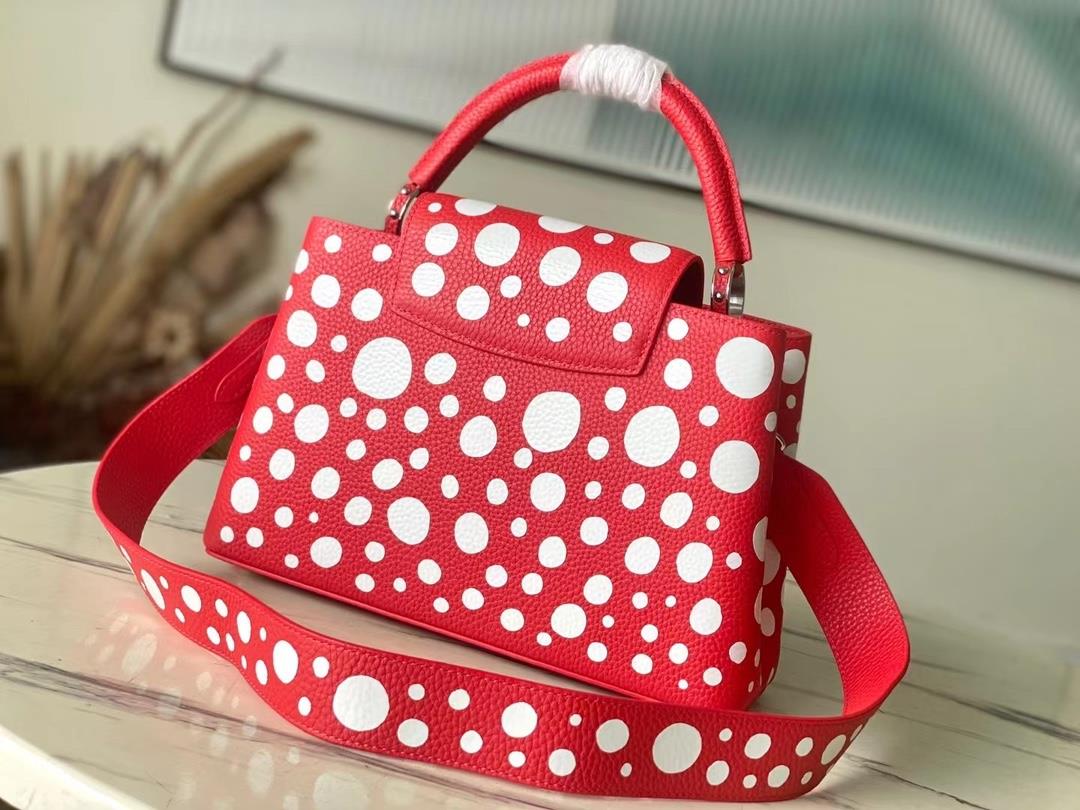 Top level original sheet M21692 48865 red spell white dot medium x Yayoi Kusama cooperation series reinterprets traditional design from an artistic perspective This LV x YK Capucines handbag turns the psychedelic waves described by the artist into colorful prints, presented in the soft Taurillon leather zipper inner bag through silk screen printing process, pumpkin shaped zipper head indicates another classic image in Yayoi Kusama's works Size 31.5 20 11 cm E681400