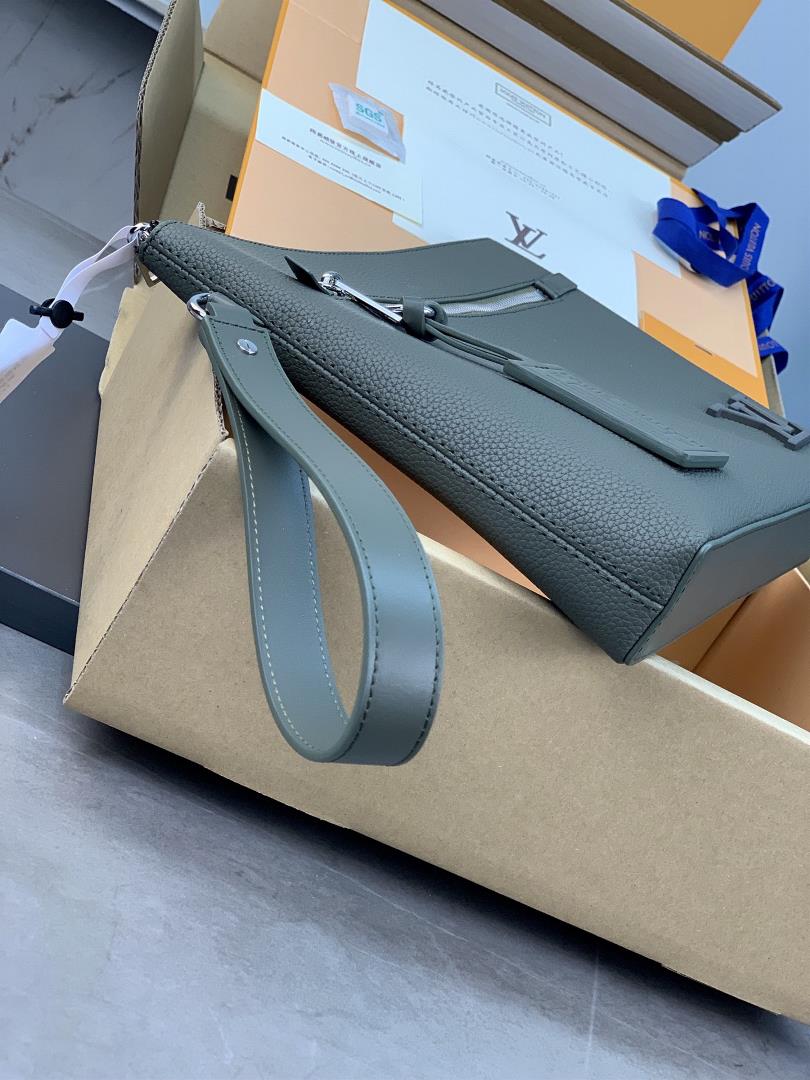 Upgraded version M69837 green AEROGRAM handbag The new Aerogram handbag releases a trendy style with an introverted design. The soft and delicate calf leather resembles old-fashioned aviation letterhead, with metal letters and customizable labels showcasing classic heritage. Elements such as detachable leather wristbands enhance functionality. Size 30 x 22 x 5 cm E68500