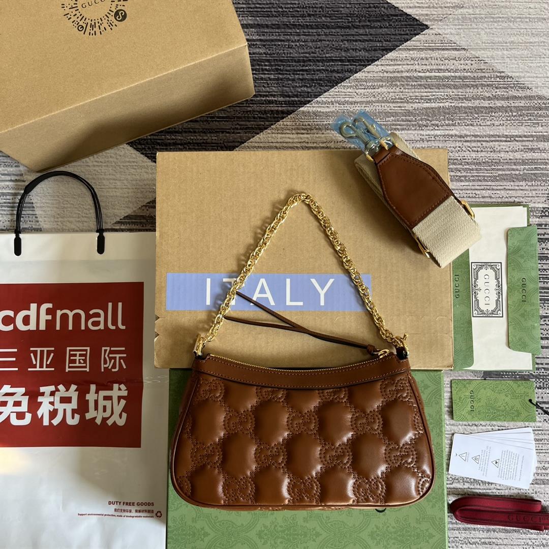 . Equipped with a complete set of counter green packaging, the new GG Mateless leather handbag interprets the brand's iconic materials with a soft texture. The textured GG pattern vividly portrays a series of handbags, including this pink leather handbag. The front is adorned with dual G accessories, injecting brand identity into the entire design. Pink GG Matelass leather, gold tone accessories, dual G, zipper closure. Two detachable shoulder straps made of ivory white nylon and gold tone metal .Model 735049 .Size 25 W x 15 H x 8cm DThe color is brown embossed.(professional luxury fashion brand agent business)