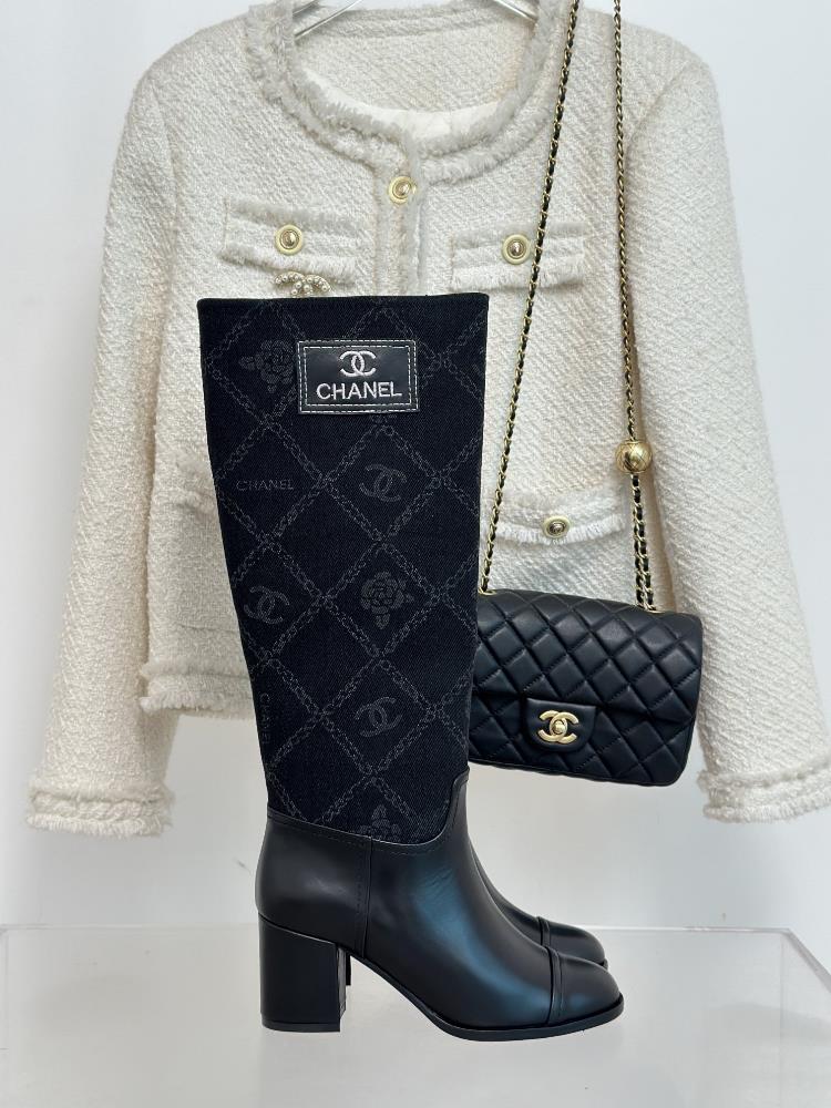 Introducing the latest addition to the Chanel footwear collection - the long boots with a thick heeled denim finish. These boots are the perfect blend of style and comfort, making them a must-have for any fashion-conscious individual. Crafted from high-quality cowhide leather and denim fabric, these boots are built to last. The thick heeled design provides ample support and stability, making them perfect for long walks or a night out on the town. The denim finish adds a touch of casual elegance, making them versatile enough to wear with a variety of outfits. The boots come in a range of colors, including classic black and blue denim. The black boots are perfect for a more formal occasion, while the blue denim boots are ideal for a more casual look. The boots are available in a range of sizes, ensuring a perfect fit for everyone. The inside of the boots is lined with soft denim fabric, providing a comfortable and snug fit. The boots are easy to slip on and off, thanks to the convenient side zipper. User reviews of these boots have been overwhelmingly positive, with many praising the quality of the materials and the comfortable fit. One user said, "These boots are amazing! They are so comfortable and stylish, I wear them everywhere." Another user commented, "I love the denim finish on these boots, they add a touch of casual elegance to any outfit." The latest news from Chanel is that these boots are selling fast, so don't wait too long to get your hands on a pair. They are the perfect addition to any wardrobe, and are sure to become a staple in your shoe collection. In conclusion, the Chanel long boots with a thick heeled denim finish are a must-have for any fashion-conscious individual. They are crafted from high-quality materials, come in a range of colors and sizes, and are comfortable enough to wear all day long. Don't miss out on the latest addition to the Chanel footwear collection - get your pair today!