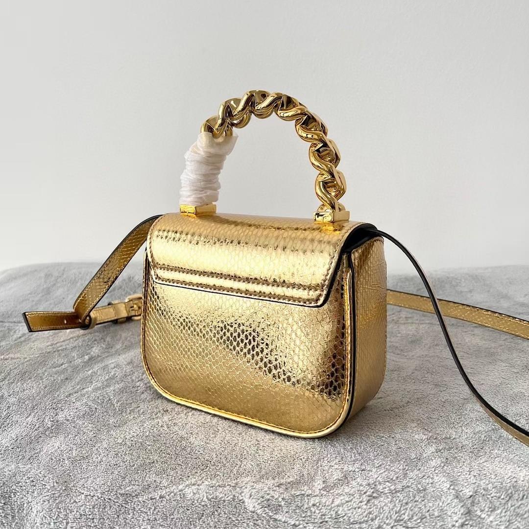 Golden SnakeVERSACE Golden Snake wrapped up the modern corner of the little queen in the early autumn of 2022, and met Medusa in Tanning with a trendy attitude. The striking golden Medusa plate and handle added to the fashion. The central Medusa is quite recognizable. This design is equipped with a fixed chain top handle, and a detachable and adjustable shoulder strap is also available. Three internal card slots. Model 1066 Size 16x6x12cm(professional luxury fashion brand agent business)