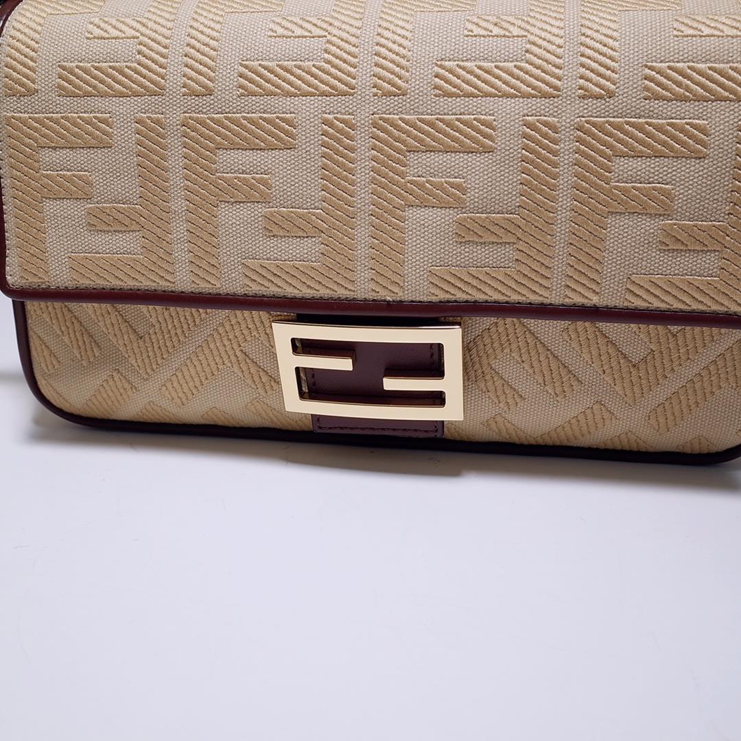 The FEND1 iconic Baguette handbag is made of beige canvas material adorned with FF pattern embroider