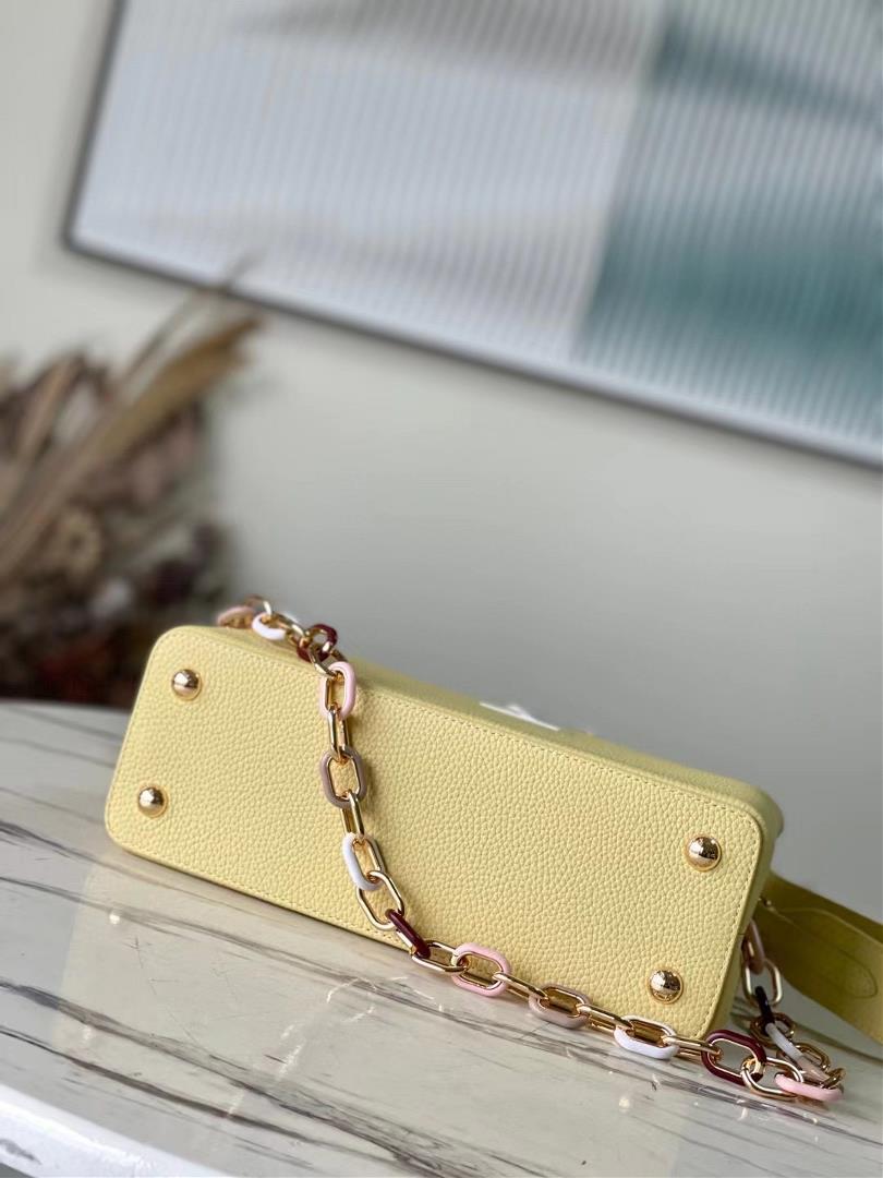 The top-level original M21798 yellow medium size Capuchines medium size handbag is made of Taurillon leather, with metal and resin chain links interlocking with each other. In addition to the top handle and detachable wide shoulder strap, it adds a fun carrying style. The iconic flip closure of the Capuchines series showcases the logo. Dimensions 31.5 x 20 x 11 cm E681550(professional luxury fashion brand agent business)