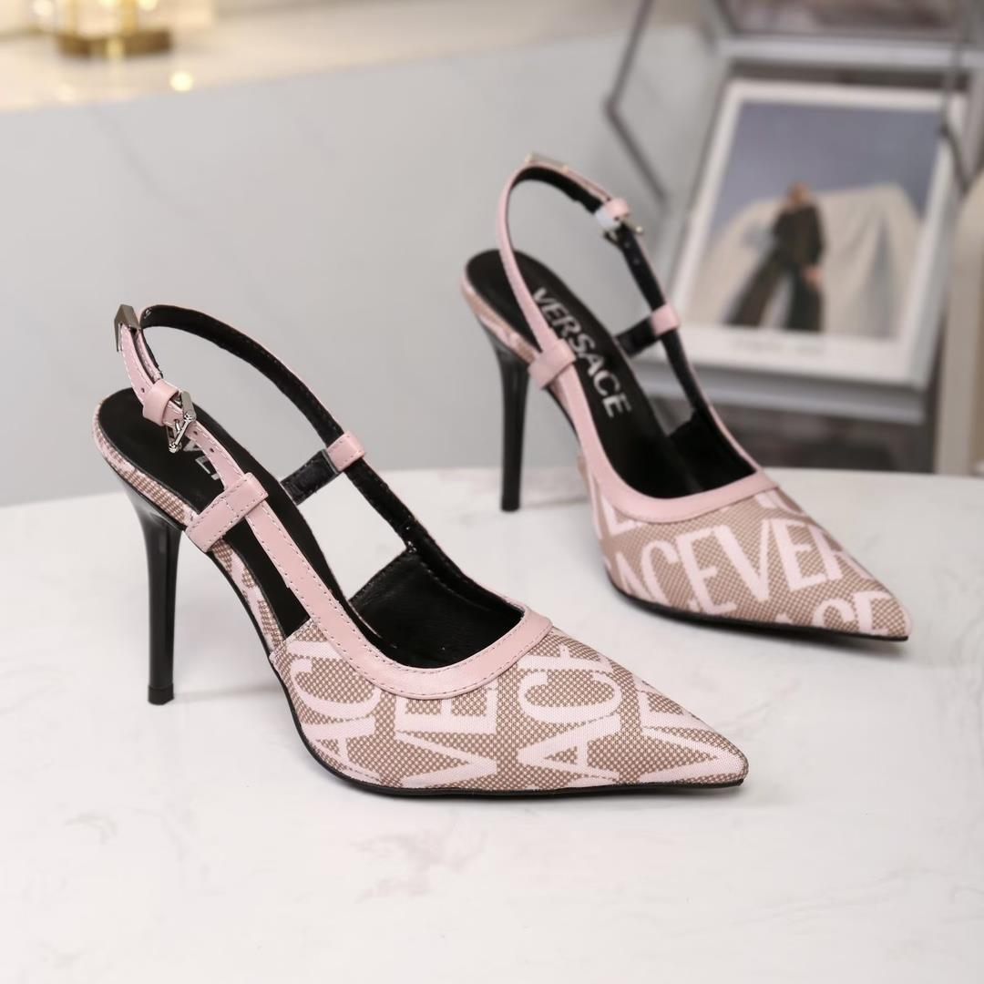 Versaces new Baotou peep heel highheeled shoes fabric canvas jacquard pattern with leather decora